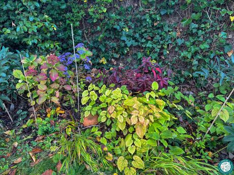 📋 Pour vous aider, voici la liste (non exhaustive) de ce que j’ai planté : tison de satan ‘Happy halloween’, saxifrage ‘Hsiou Silver’, lamier ‘Aureum’ et ‘Herman’s Pride’, hosta ‘Remember Me’, hellébore ‘Anna’s Red’, callicarpa ‘Cardinal’, Oxalis triangulaire, cyclamens de Naples et Coum, Acter ‘Atropurpurea’, Aster ‘Treffpunkt’ et ‘Nicole’ et ‘Isle Bremsell’, heuchères, sédum ‘Variegatum’ et ‘Dark Magic’, eupatoire, Tricirtis ‘Sanko Fu’ et ‘Long-Jen Violet’, aspérules odorantes, Itéa ‘Little Henry’, Clématite ‘Arabella’, épimedium ‘Red Maximum’, ciboule et ciboulette, menthe chocolat, roquette vivace, thym citron, …